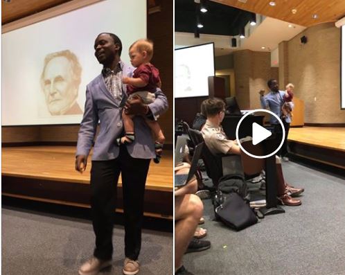 Il docente, oltre ad avere acconsentito, si è anche fatto carico di intrattenere il bambino mentre stava esponendo la sua lezione a 300 studenti presenti in aula.
