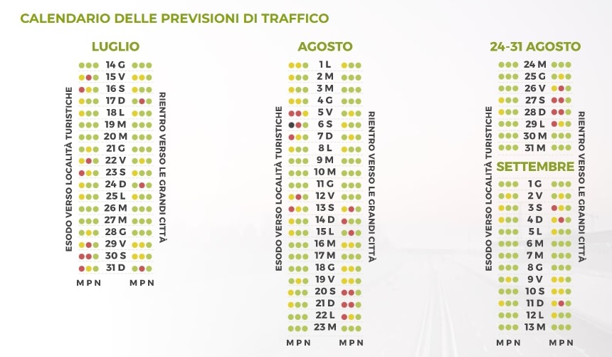 Per quanto concerne invece i rientri verso le grandi città, attenzione alle intere giornate di sabato 13 agosto e anche per il secondo rientro del weekend tra sabato 20 e domenica 21 agosto, poi ancora da venerdì 26 agosto fino alla mattina di lunedì 29, dove è concentrata la maggior parte dei bollini “rossi”.