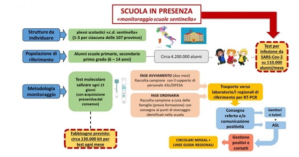 Chiave di volta del piano è la cosiddetta “rete di scuole sentinella”. Di che si tratta? Degli istituti indicati dalle autorità sanitarie regionali, in collaborazione con gli uffici scolastici, che saranno coinvolti da un’attività di testing quotidiana. Grazie a questo sforzo collettivo, almeno 55mila alunni di età compresa fra i 6 e i 14 anni ogni 15 giorni saranno sottoposti a tampone molecolare salivare.
