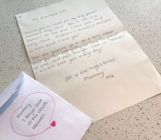 “Mia bellissima Ella, grazie per il biglietto. Sono fiera di te e anche se sono in Paradiso, veglio su di te ogni giorno. Tanti baci, la tua mamma”.