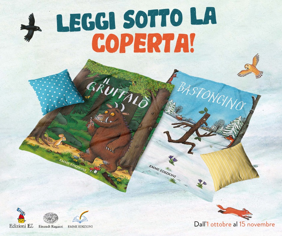 L’iniziativa, chiamata appunto “Leggi sotto la coperta” è stata lanciata dalla casa editrice Edizioni EL, in collaborazione con Einaudi ed Emme Edizioni. Acquistando libri per bambini di queste case editrici per un valore di €20, potrete ricevere una calda coperta, scelta casualmente tra il modello dedicato al Gruffalò e quello di Bastoncino.