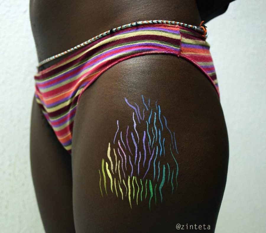 Cinta Tort Cartró, in arte Zinteta, è una giovane artista di Barcellona che, con le sue idee creative, sta cercando di insegnare alle donne a non vergognarsi del proprio aspetto fisico. Lo fa dipingendo le smagliature con un arcobaleno di colori e gli slip, i tamponi e gli assorbenti con glitter e vernici che rendono più divertente e meno stressante l’arrivo delle mestruazioni. Crea la bellezza dove non la vediamo, dà valore a qualsiasi corpo con cellulite e cicatrici, trasformando i difetti in arte.